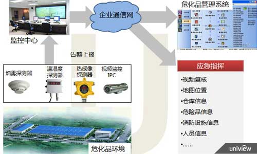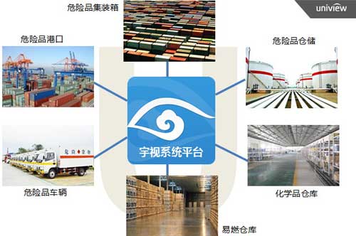宇視可視化智慧安監(jiān)方案基于開放的IMOS平臺,通過接入相關(guān)的智能環(huán)境探測器,報(bào)警聯(lián)動視頻,并將環(huán)境信息、視頻監(jiān)控融合到企業(yè)安全生產(chǎn)應(yīng)用系統(tǒng)和危險(xiǎn)品監(jiān)管中,可以應(yīng)用在危化品的生產(chǎn)、運(yùn)輸、倉儲、銷售等各個環(huán)節(jié),包括廠房、港口、倉庫、站點(diǎn)等。