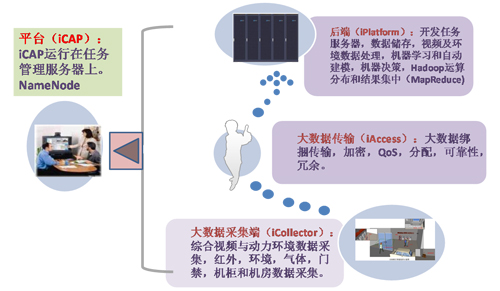 具體在大數據采集端,根據實際需求,提供集綜合視頻與動力環境采集于一體的、可以分布式部署的綜合采集設備,以完成各類綜合信息的有效提取。同時,也將根據架構的需求,在設備方面賦予一定的智能分析功能。綜合采集設備所提取、處理的各類信息,將通過一線(大數據傳輸),在保證安全可靠的情況下完成大數據混合處理,傳輸到后端。在后端,對海量數據開展匯聚、分類、管理、加工等工作。最后,通過iCAP平臺,為各類用戶提供滿足信息、結論、及時、簡單、智能五大核心需求的服務。