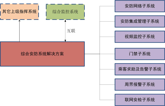 軌道交通綜合安防系統由安防網絡子系統、安防集成管理子系統、視頻監控子系統、門禁子系統、車站乘客求助及告警子系統、周界報警子系統、聯網安檢子系統等構成。